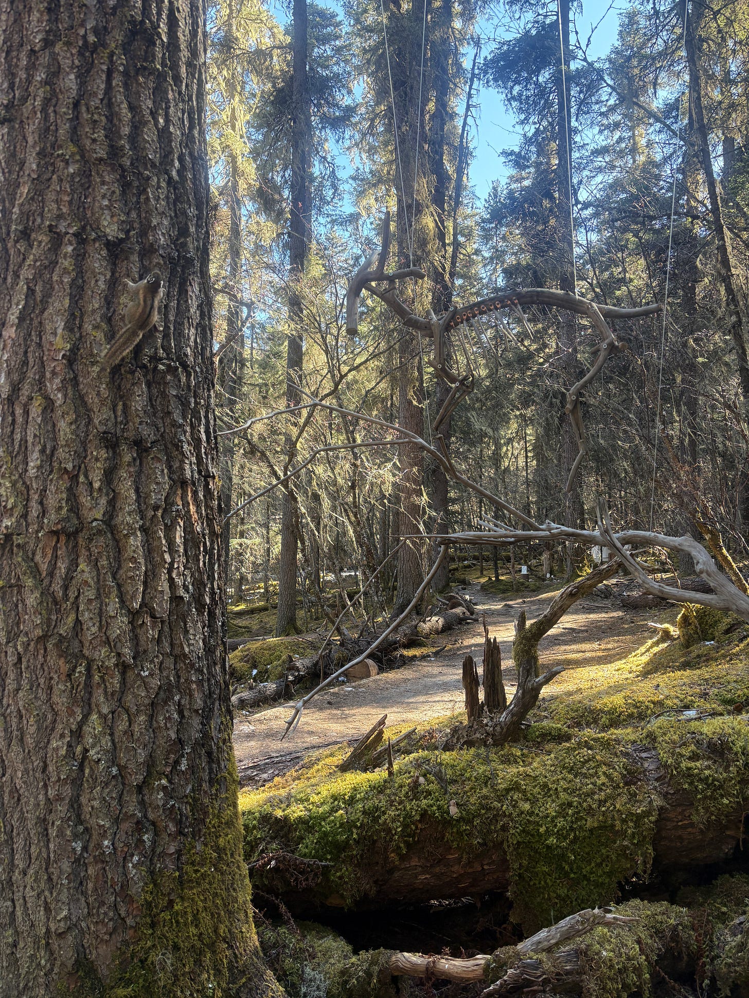 We were looking at the work “Sheep” by Salome, a skeleton of a sheep made out of deadwood found by the water, when a squirrel, perhaps asking for food since Liz was crunching on her fourth biscuit by that time, hopped on and cruised it like a rope bridge, creating a cascade of sounds with the suspended moving parts.