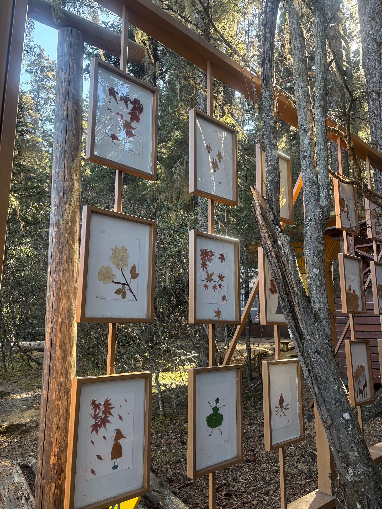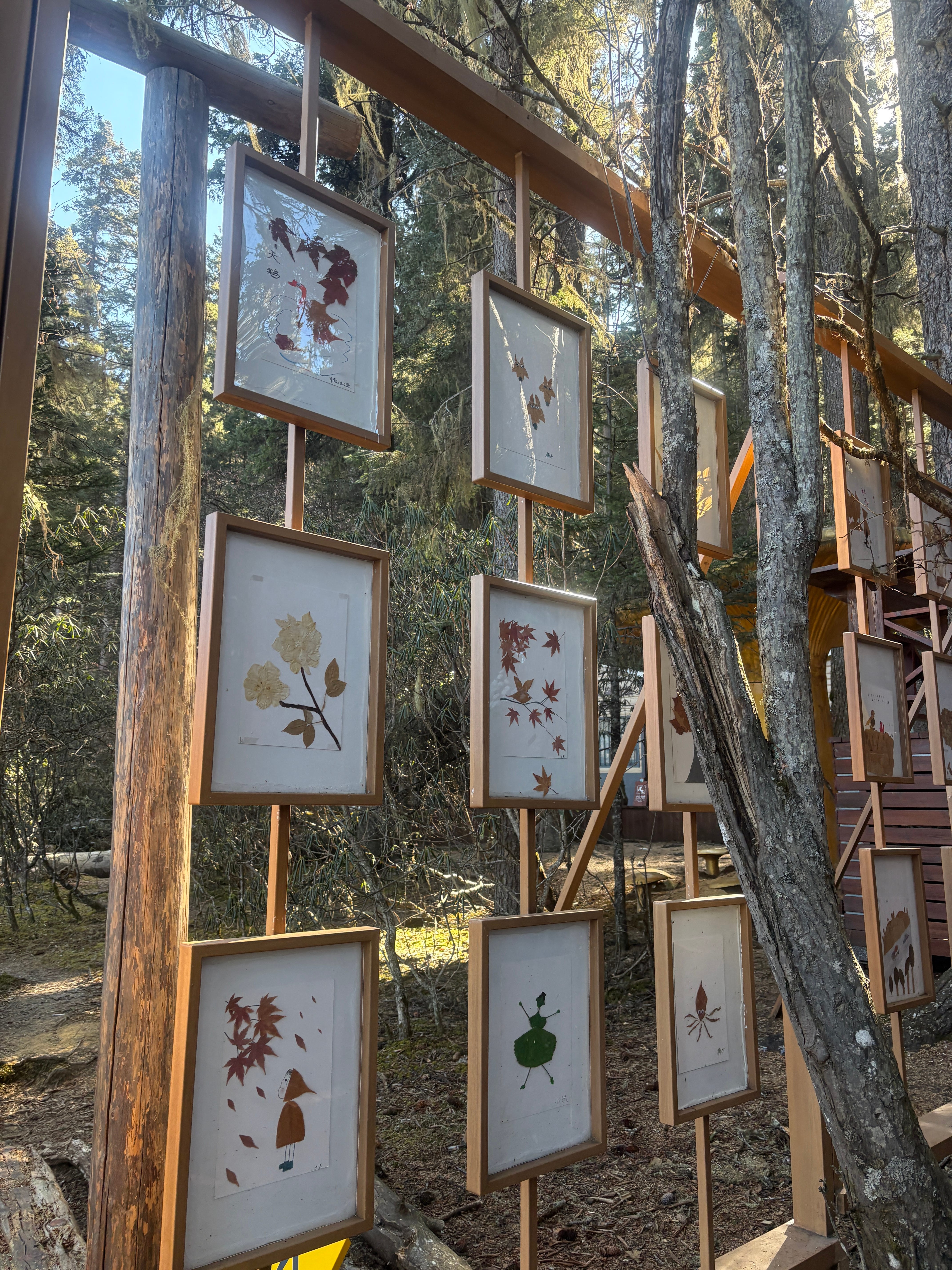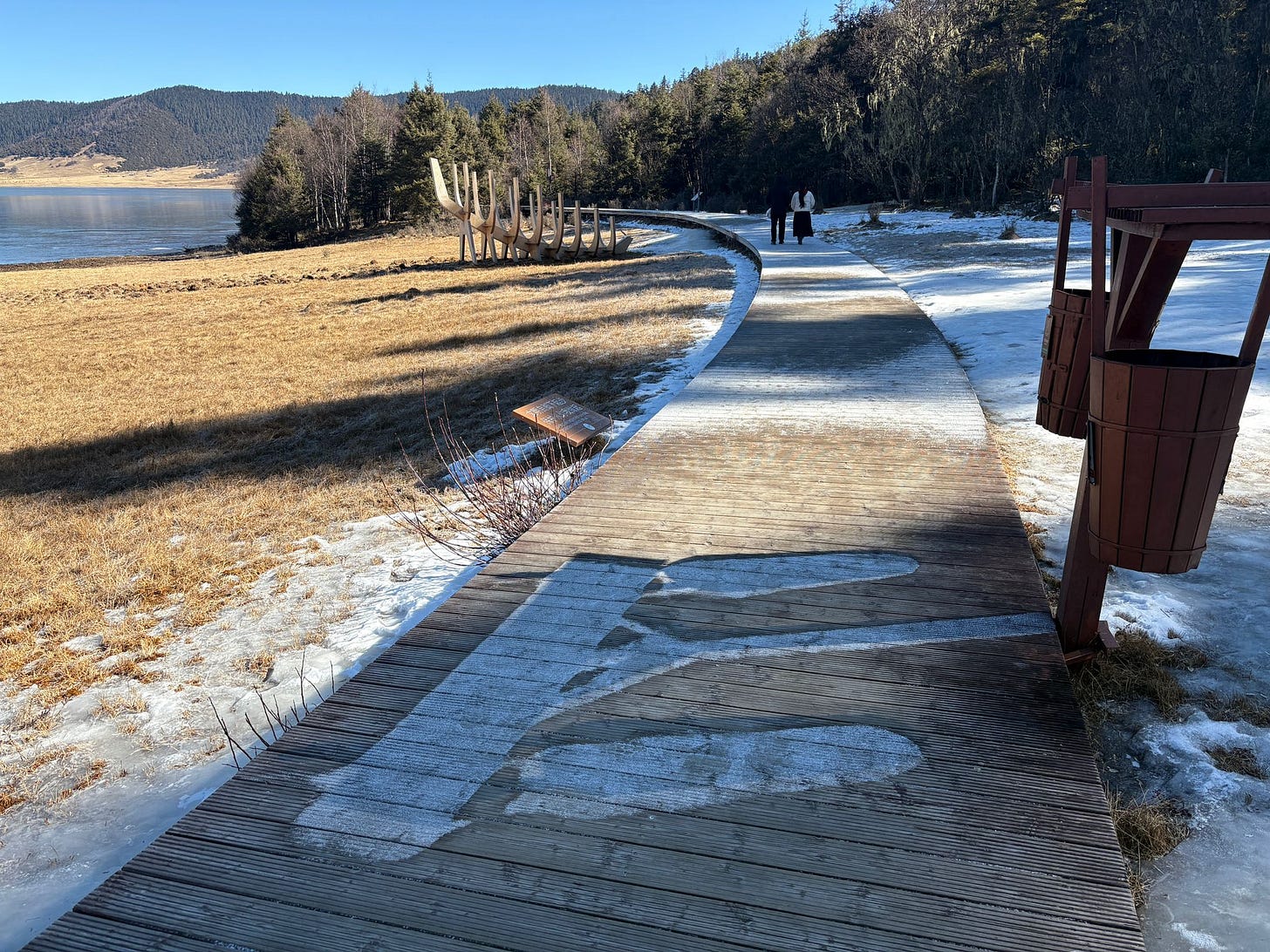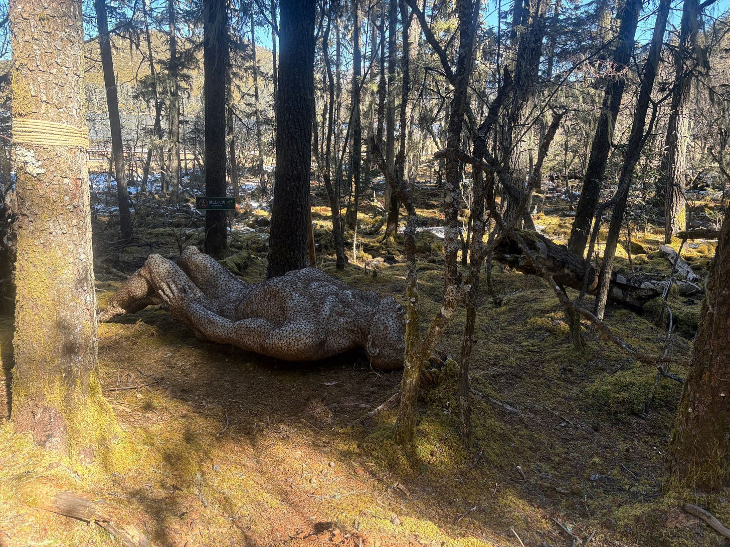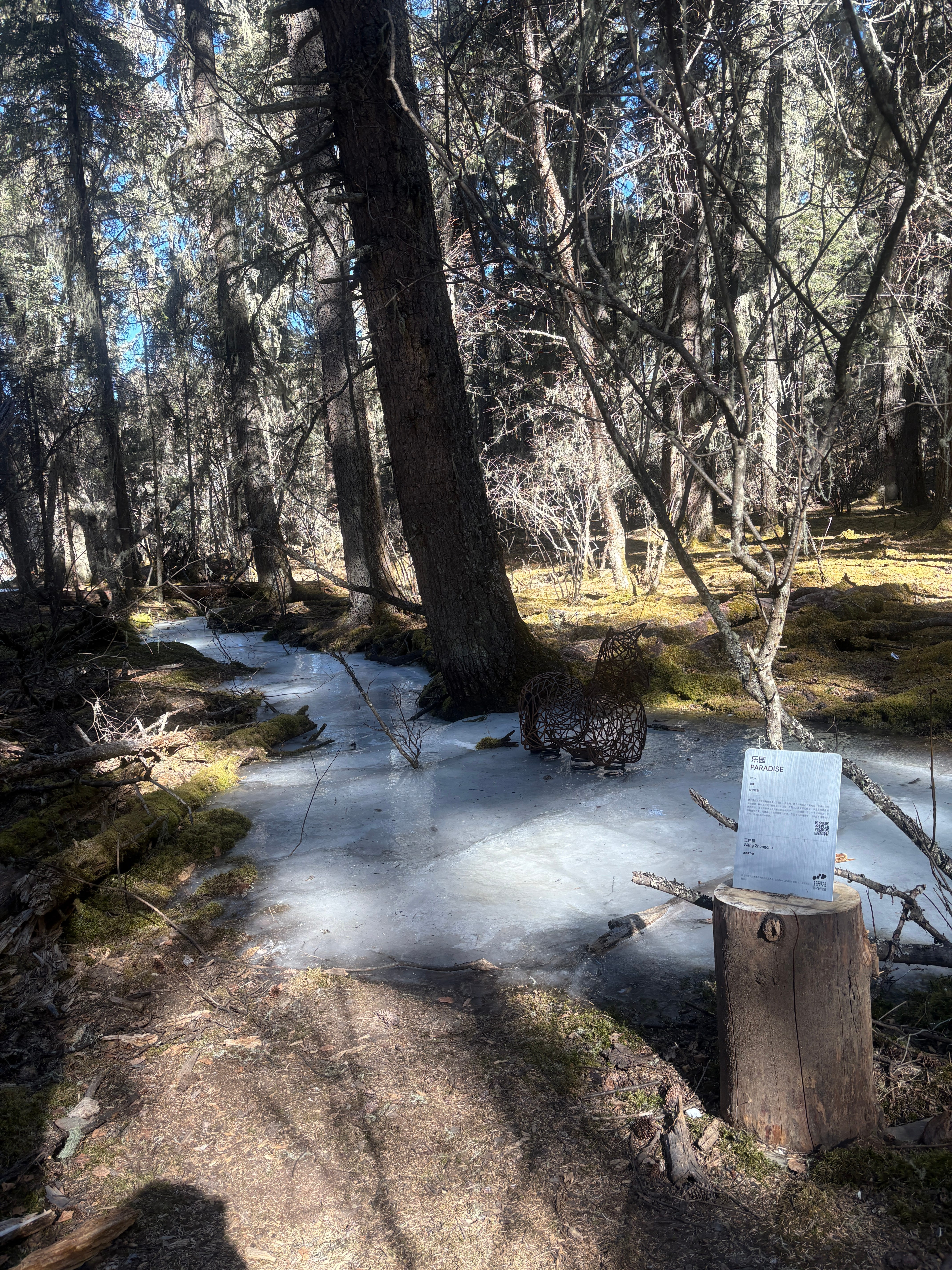 Part of the trail around the Shuda Lake 属都海 circled off into a quieter path, leading us into the alpine forest marked by pathways made with wooden logs. With the surfaces of the wood frosted in the cold, we were asked to be careful while trailing through eco-art installations set up by dozens of artists from China. It is a big pity we did not take pictures of most of the artwork signages…