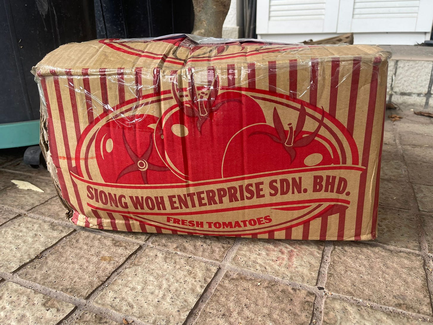 We purchased more soil for this setup and to our amusement, it arrived in a box labelled “fresh tomatoes”.