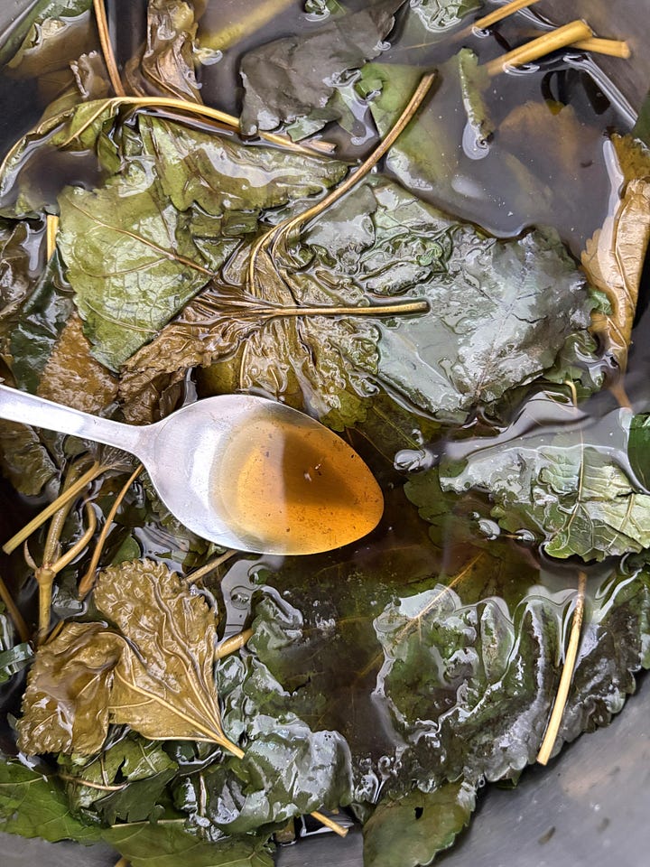and how the yellow dye from the leaves (which can also be drunk as tea) becomes subtle iron-green pigments.